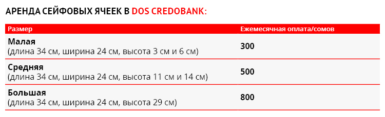 Dos Credobank предлагает вам надежное и безопасное место для хранения ваших ценностей — индивидуальные банковские сейфы. В банковских сейфовых ячейках вы можете хранить ценные документы, драгоценности, наличные средства, цифровые носители и все, что вам дорого и важно. Сейфовые ячейки могут быть арендованы как на длительный срок, так и на короткий — на время поездки, например.