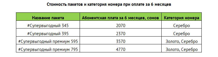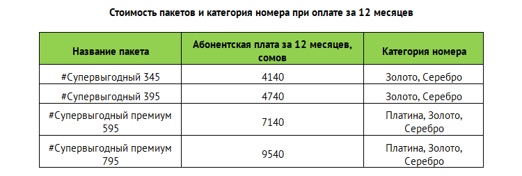 Номера категории «Серебро», «Золото» и «Платина 7500» можно получить бесплатно в фирменных салонах MegaCom или центрах продаж и обслуживания абонентов при внесении единоразовой абонентской платы за 6 или 12 месяцев (180 и 360 календарных дней) по пакетам #Супервыгодный 345, #Супервыгодный 395, #Супервыгодный 595 и #Супервыгодный премиум 795 (категории номеров зависят от выбранного пакета).
