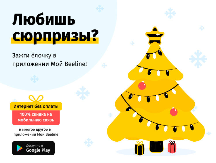 Тогда зажигайте елочку в приложении «Мой Beeline» и получайте призы: интернет без оплаты, 100-процентную скидку на мобильную связь и многое другое!