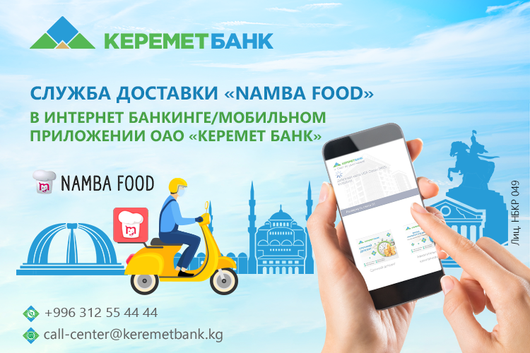 Служба доставки Namba Food гарантирует, что курьер заберет и доставит заказ в течение часа по указанному адресу, а «Керемет Банк» поможет мгновенно рассчитаться за покупку в режиме 24/7.