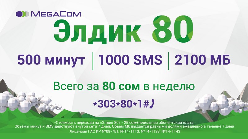 Перейти на тариф и подключить опцию можно, набрав *303*80*1# вызов (стоимость перехода - 25 сомов). Новая серия «Элдик» от MegaCom предлагает воспользоваться одной из пяти выгодных опций на выбор. Подберите то, что нужно именно вам, в опциях «Элдик50», «Элдик80», «Элдик120», «Элдик160», «Элдик210». Подробнее на сайте www.megacom.kg.