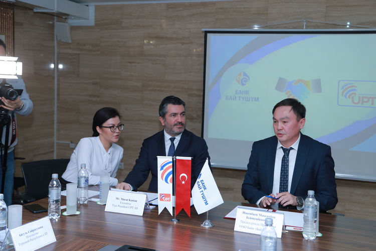 Подписание соглашения проходило в узком кругу с участием вице-президента компании UPT AS Мурата Кастана, председателя правления банка «Бай Тушум» Максатбека Ишенбаева, представителей посольства Турции и МИД КР, а также президента Союза банков Кыргызстана Анвара Абдраева, заместителя исполнительного директора МДС Дастана Иманалиева и других.