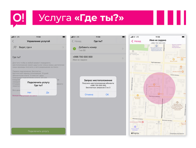 Первые 10 дней с момента активации подписки услуга предоставляется бесплатно, далее абонентская плата составляет 3 сома в сутки. Ежедневно предоставляется до трех бесплатных запросов в день на определение местоположения близких. Подробнее об услуге — на www.o.kg