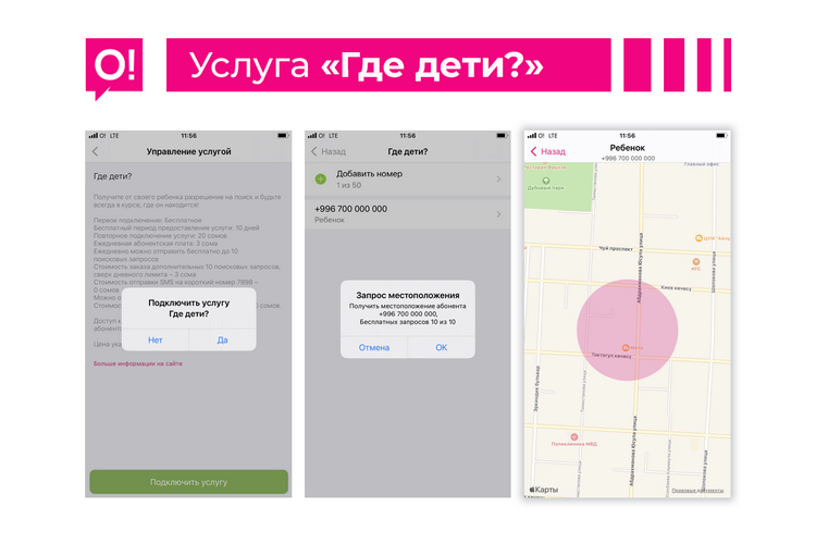 При первом подключении услуга 10 дней предоставляется бесплатно, после абонентская плата составит 3 сома в сутки с возможностью отправлять до 10 бесплатных поисковых запросов ежедневно. Интернет-трафик при просмотре карты с координатами не тарифицируется. Услуга действует на всей территории Кыргызстана в обширной зоне действия сети О!. Подробная инструкция доступна на сайте o.kg.