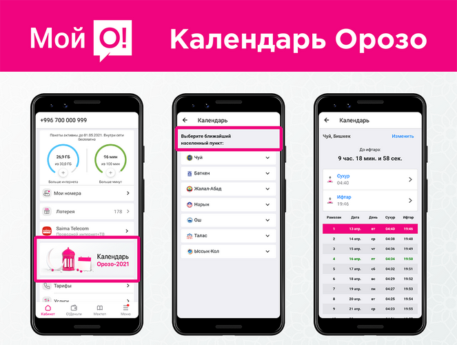 Для удобства постящихся в приложении «Мой О!» доступен онлайн-календарь Орозо с расписанием для всех регионов Кыргызстана.