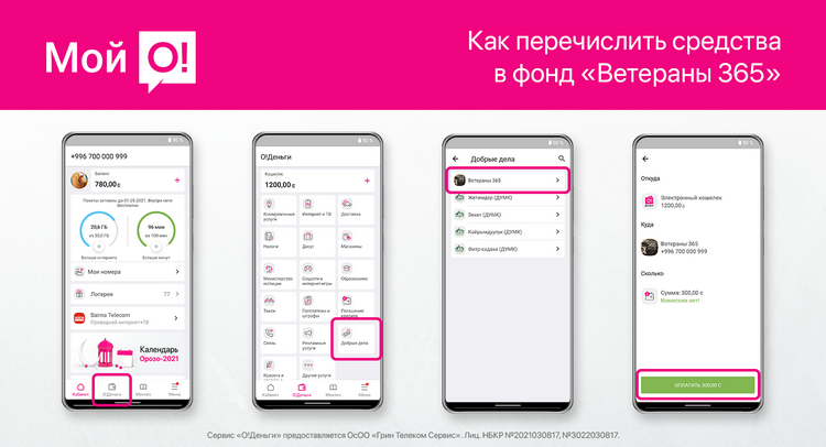 Сервис «О!Деньги» предоставляется ОсОО «Грин Телеком Сервис» в рамках доступного перечня услуг. Лицензии НБ КР № 2021030817, 3022030817.