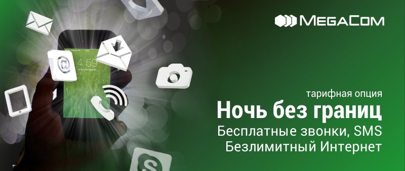 Сколько бы вы ни скачали, проговорили или отправили SMS, абонентская плата за одну ночь составит всего 30 сомов (*091*1#) или 200 сомов за месяц (*091*30#). Подробнее о безлимитной опции читайте на сайте www.megacom.kg.