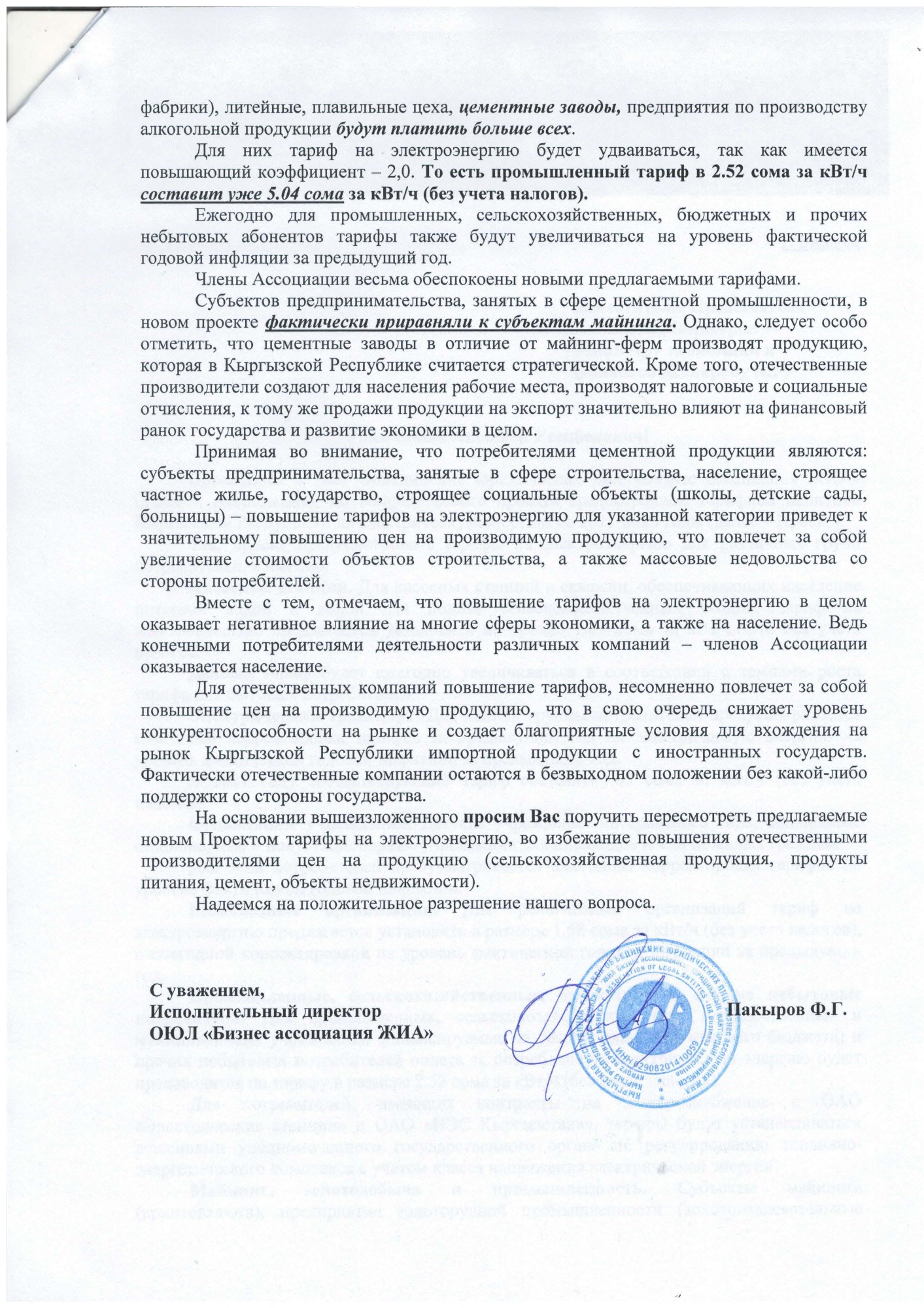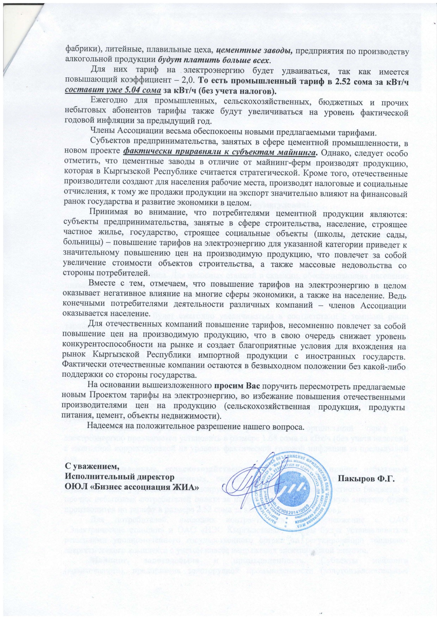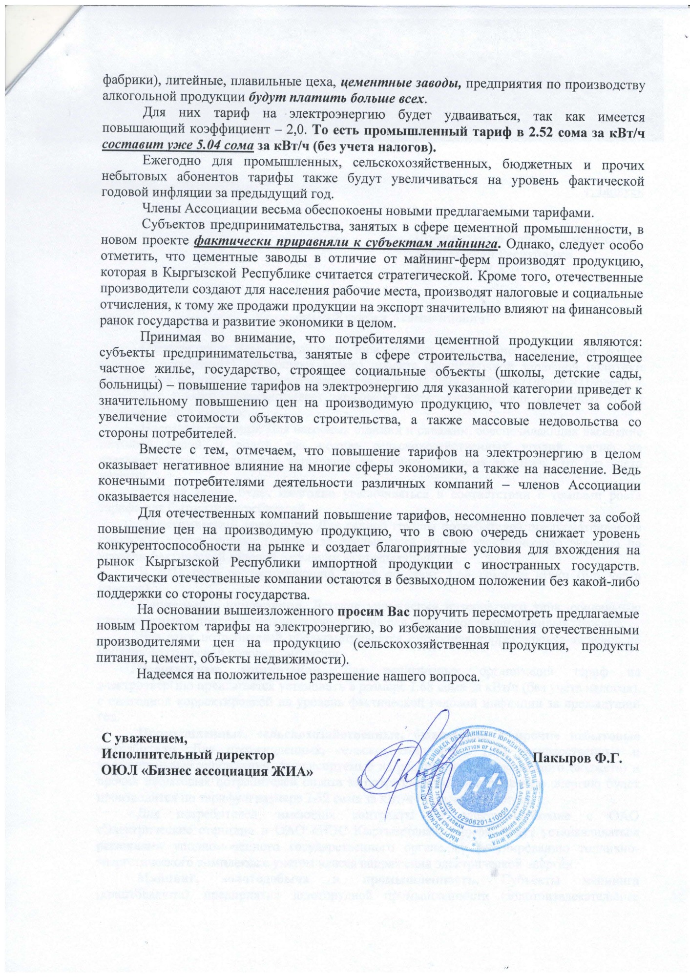 В письме отмечается, что проектом ССТП предлагается повысить тарифы для промышленного сектора с 2,24 до 2,52 сома за киловатт-час, то есть на 12,5 процента.