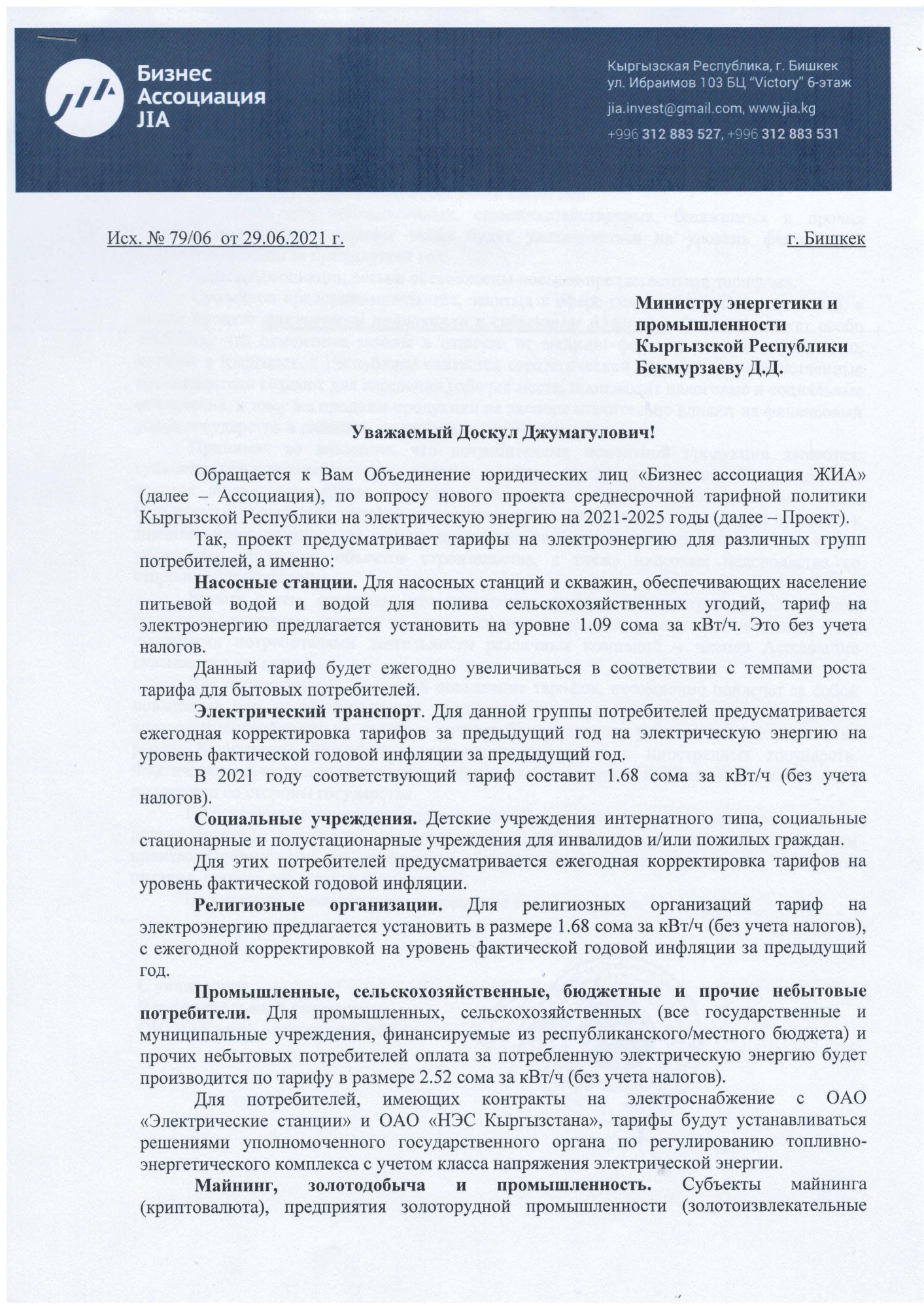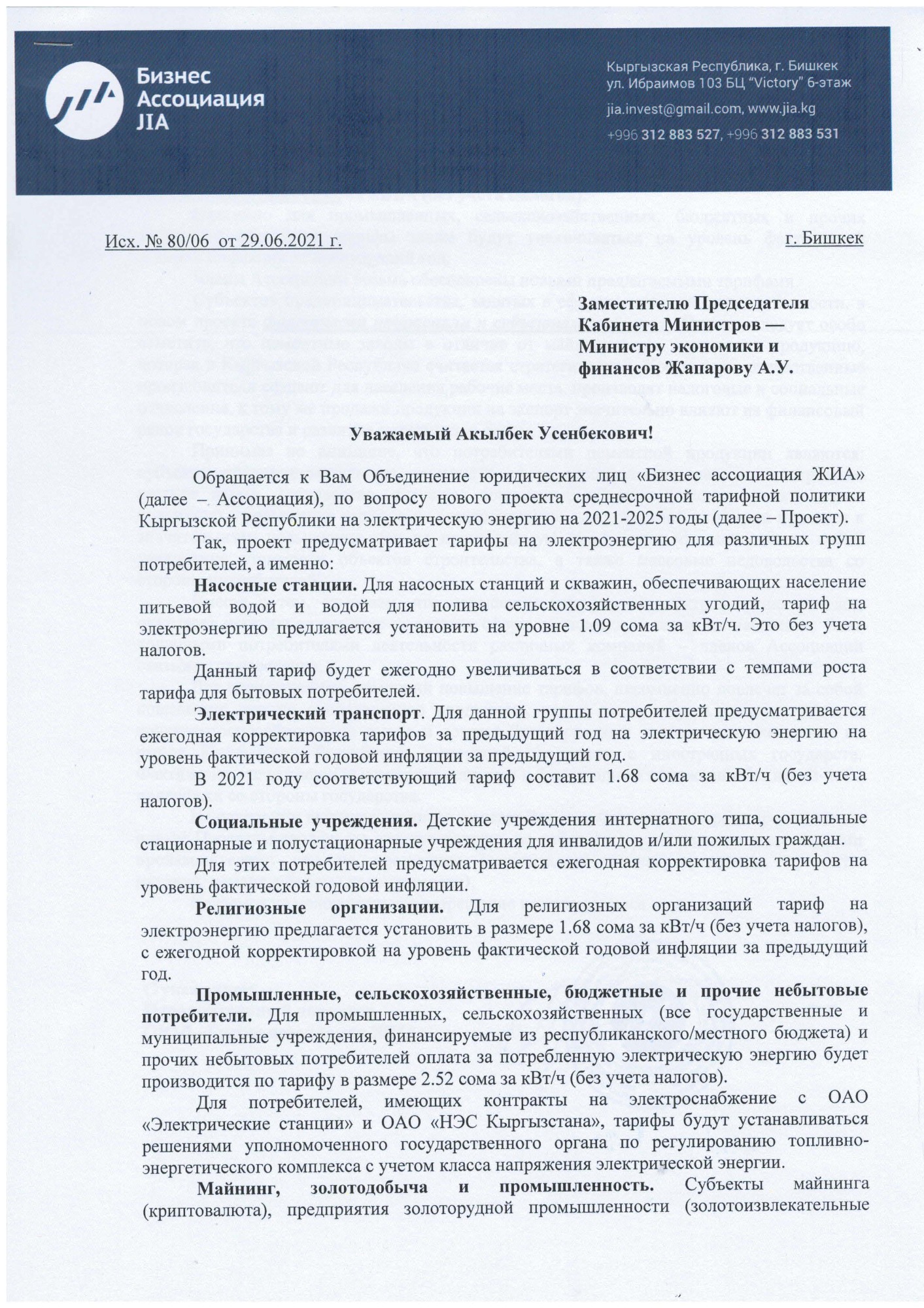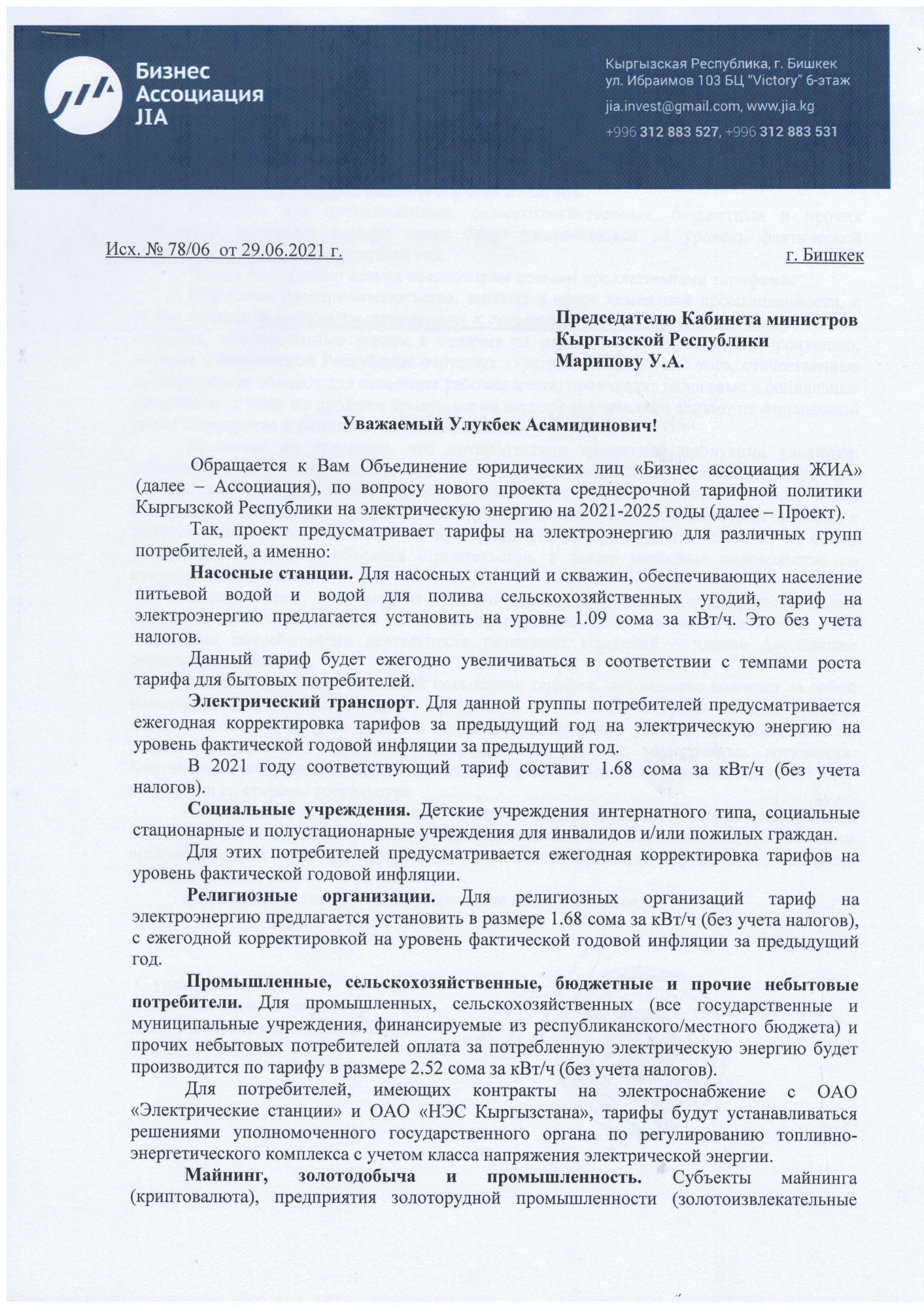 В письме отмечается, что проектом ССТП предлагается повысить тарифы для промышленного сектора с 2,24 до 2,52 сома за киловатт-час, то есть на 12,5 процента.