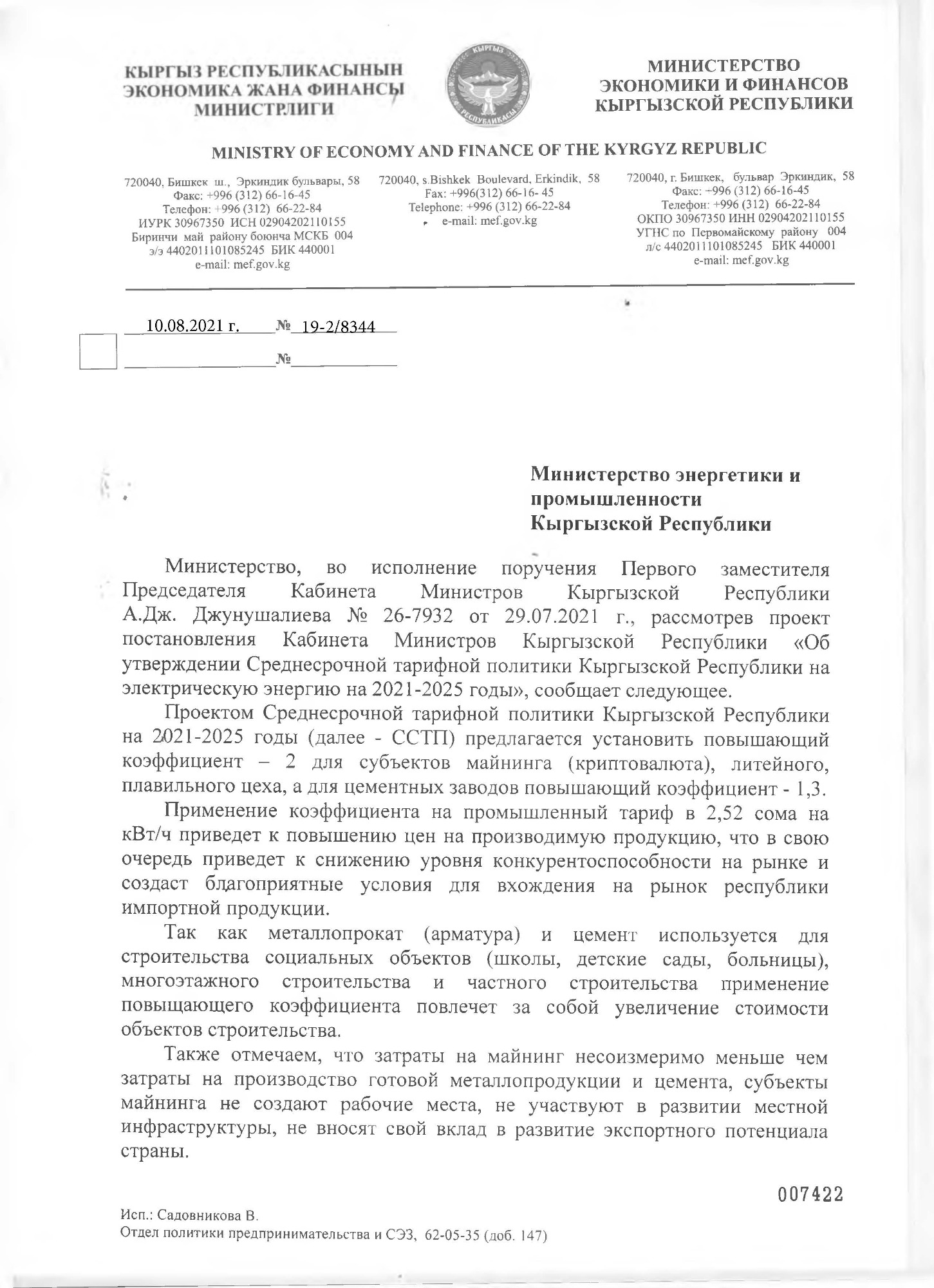 В проекте, напомним, предлагается повысить базовые тарифы для небытовых потребителей с 2,24 до 2,52 сома за киловатт-час, а также применять повышающий коэффициент 2 для отдельных категорий потребителей, что противоречит законодательству КР. Из-за чего стоимость вместо заявленных 2,52 составит 5,04 сома за киловатт-час.