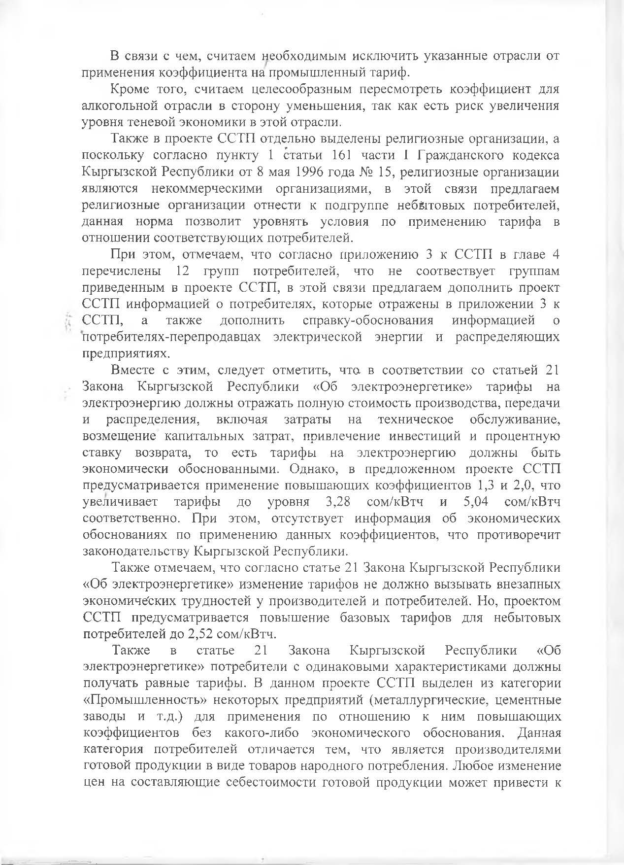 «По закону об электроэнергии тарифы должны отражать полную стоимость производства, передачи и распределения, включая затраты на техническое обслуживание, возмещение капитальных затрат, привлечение инвестиций и процентную ставку возврата, то есть тарифы на электроэнергию должны быть экономически обоснованными. Однако в предложенном варианте среднесрочной тарифной политики отсутствует информация об экономических обоснованиях по применению коэффициентов, что противоречит законодательству», — говорится в письме.