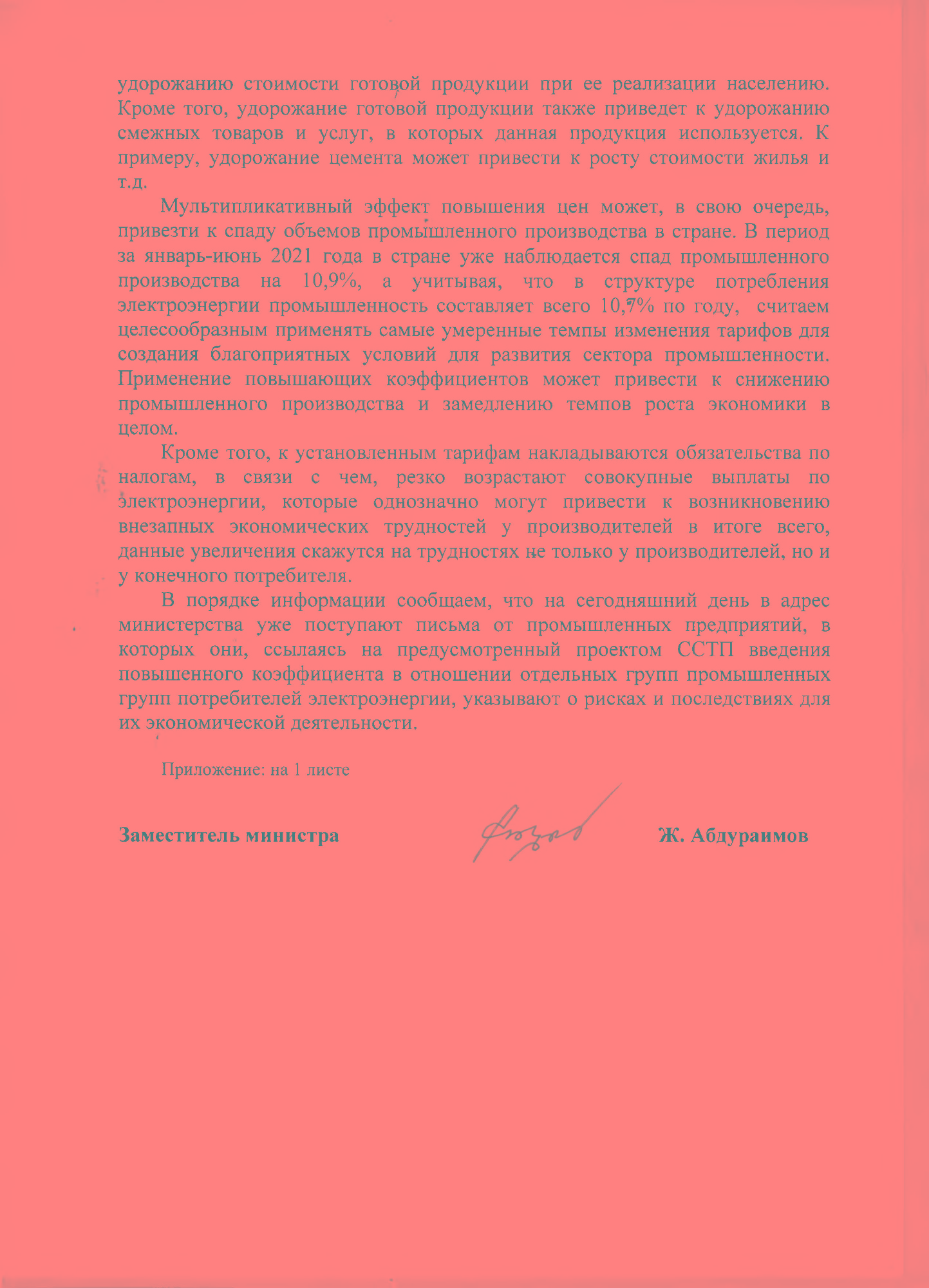 «Учитывая, что в структуре потребления электроэнергии промышленность составляет всего 10,7 процента в году, считаем целесообразным применять самые умеренные темпы изменения тарифов для создания благоприятных условий для развития сектора», — поясняется в письме Минэкономфина.