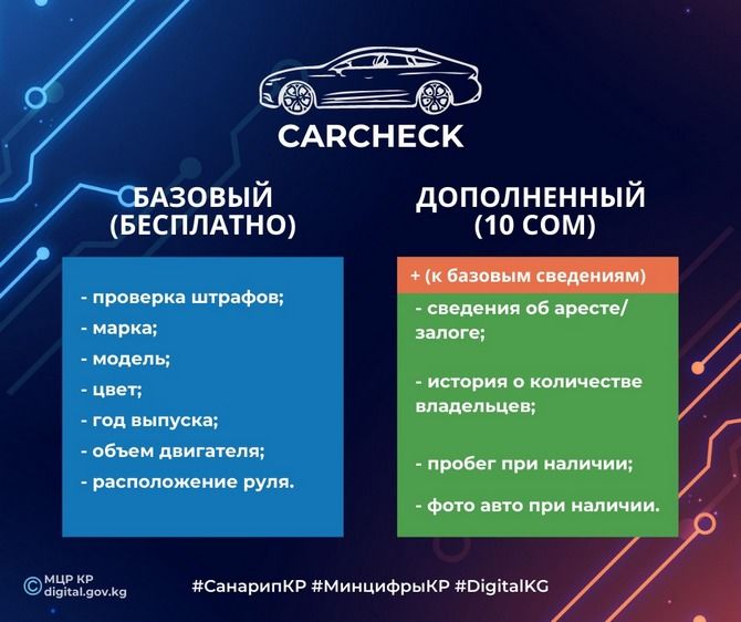 По факту рассмотрения проекта приказа Министерства цифрового развития КР* по установлению минимальной платы 10 сомов за предоставление дополнительных сервисов в рамках существующего онлайн-ресурса Сarcheck информируем.
