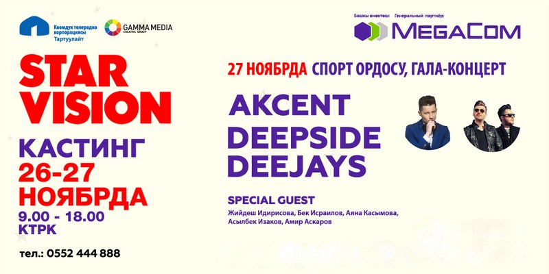 Будучи генеральным партнером грандиозного музыкального ТВ-проекта Star Vision, компания MegaCom дарит билеты на гала-концерт, который состоится завтра, 27 ноября, во Дворце спорта им.Кожомкула с участием отечественных звезд и популярных европейских групп AKCENT, Deepside Deejays и Мурад Бурауи. Участвуйте в конкурсе на страничках компании в Одноклассниках или Facebook и выигрывайте билеты!