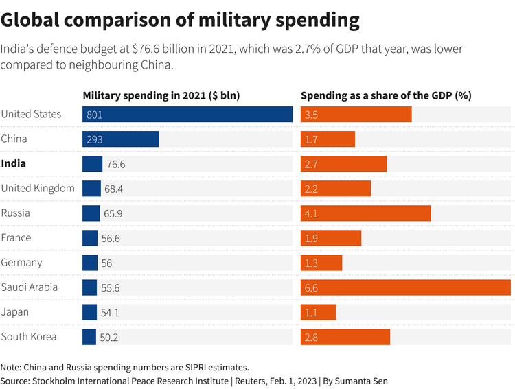 Общий оборонный бюджет Индии, который оценивается примерно в 2 процента ВВП, по-прежнему меньше, чем ассигнования Китая в размере 1,45 триллиона юаней ($230 миллиардов) в 2022 году.