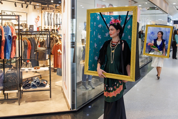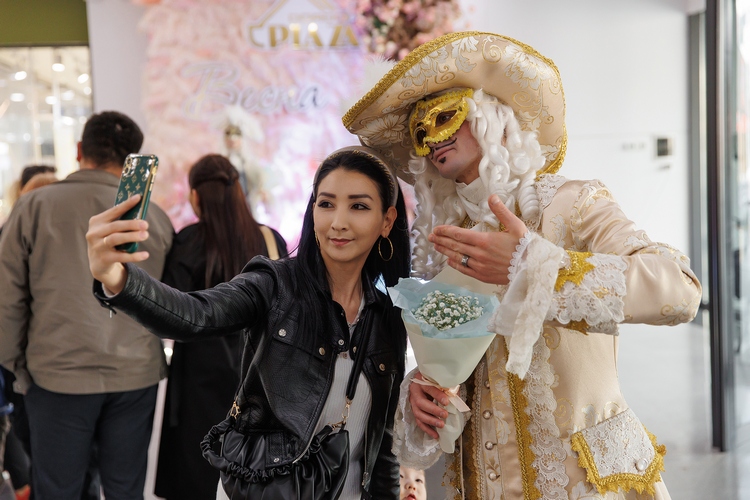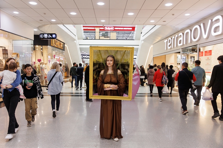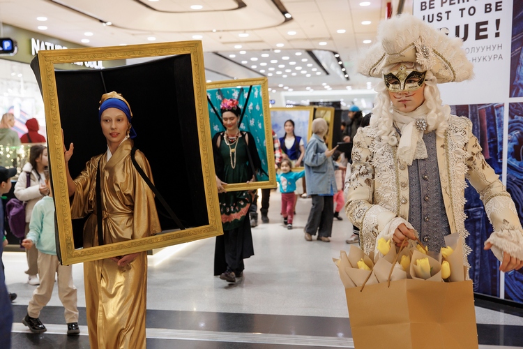 Живые скрипки звучали из разных уголков торгового центра: мелодии Баха, Боккерини, Пахельбеля окунали посетителей в атмосферу того времени. Рядом с поднимающимися на эскалаторе или стоящими у входа бишкекчанами вдруг возникали то «Дама с горностаем» Да Винчи или его же «Мона Лиза», то «Девушка с жемчужной сережкой» Вермеера, то климтовская «Адель Блох-Бауэр», то Фрида Кало с собственного автопортрета. Они не были безмолвными сопровождающими. И, конечно, их роль не ограничивалась позированием для фото. Хотя даже это многие восприняли на ура — настолько актеры вжились в свои образы и были невероятно живописны (между прочим, костюмы были детально проработаны, а профессиональный грим и парики приближали к оригиналу).