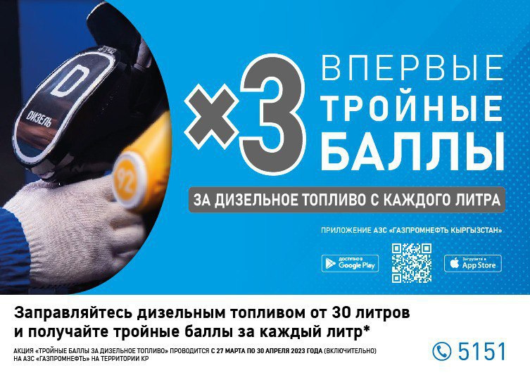 Акция «Тройные баллы за дизельное топливо» проводится с 27 марта по 30 апреля 2023 года включительно.