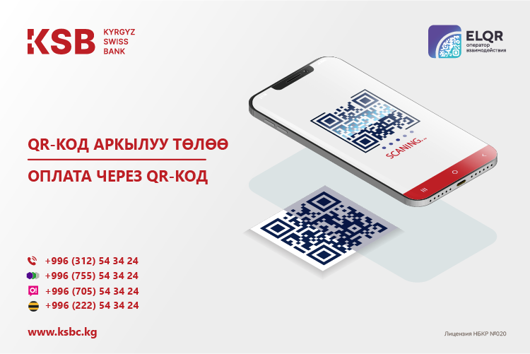 Если у вас возникнут вопросы об оплате через QR-код или других банковских продуктах, обращайтесь по электронной почте [email protected], через чат на сайте www.ksbc.kg и по телефонам контакт-центра «Кыргызско-Швейцарского Банка»: +996 (312) 54 34 24 (городской номер), +996 (705) 54 34 24 (О!), +996 (755) 54 34 24 (Megа), +996 (222) 54 34 24 (Beeline).