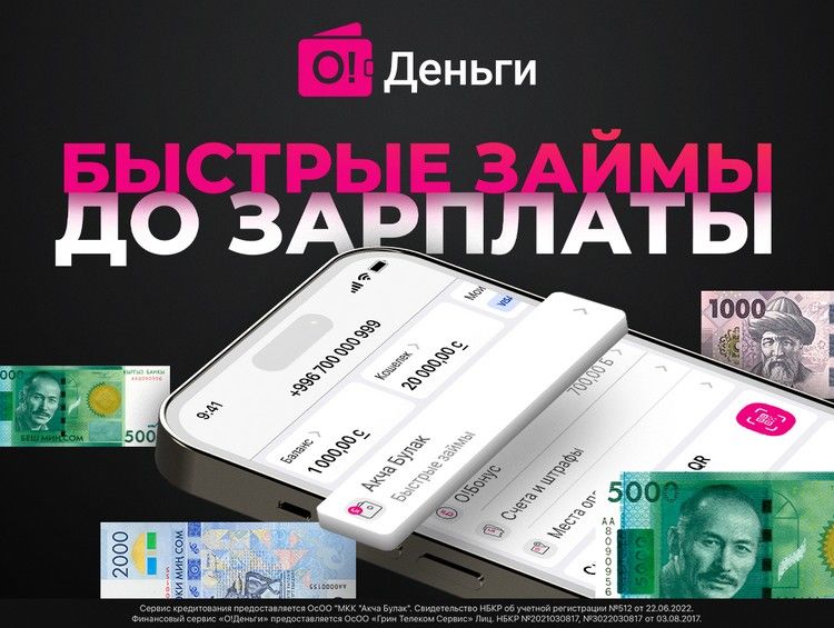 *Сервис кредитования предоставляется ОсОО «МКК «Акча Булак». Свидетельство НБ КР об учетной регистрации № 512 от 22 июня 2022 года. Финансовый сервис «О!Деньги» предоставляется ОсОО «Грин Телеком Сервис» Лицензия НБ КР № 2021030817, № 3022030817 от 03 августа 2017 года. Банк-эмитент электронных денег «О!Деньги»: ОАО «Дос-Кредобанк». Лицензия НБ КР № 037 от 18 июня 1997-го и 16 марта 2016 года.
