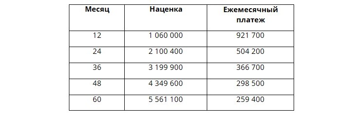 Пример расчета наценки и платежа на сумму финансирования 10 миллионов сомов.