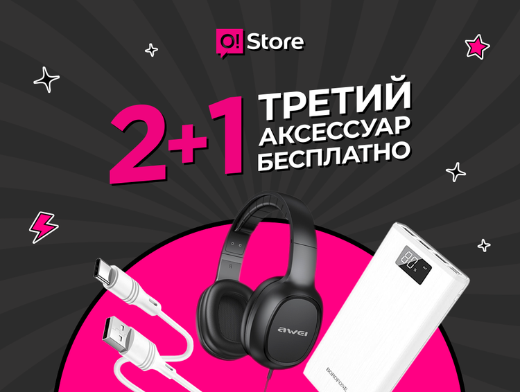 Количество товара по акции ограничено. Акция действует во всех магазинах O!Store по всему Кыргызстану. В акции участвуют аксессуары стоимостью до 1 тысячи сомов, стоимость третьего аксессуара не должна превышать наименьшей стоимости одного из купленных аксессуаров, но может быть равна наименьшей стоимости купленного аксессуара.