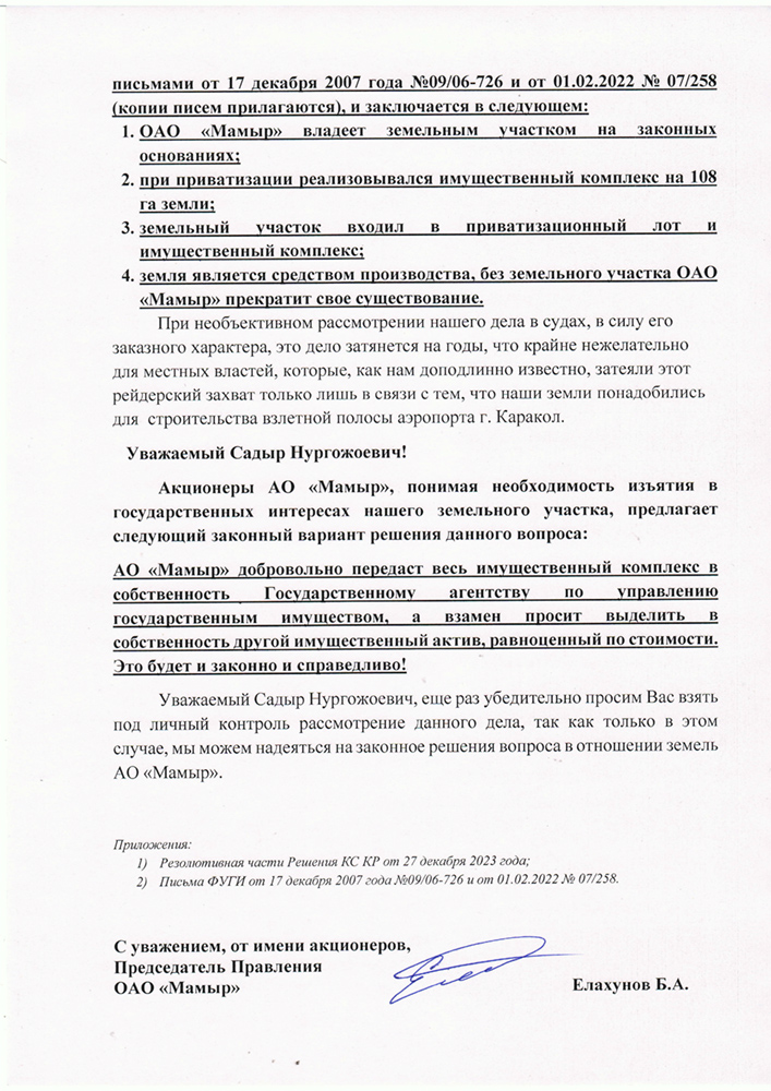Уважаемый Садыр Нургожоевич! Еще раз убедительно просим вас взять под личный контроль рассмотрение нашего дела, так как только в этом случае мы можем надеяться на законное решение вопроса в отношении земель ОАО «Мамыр».