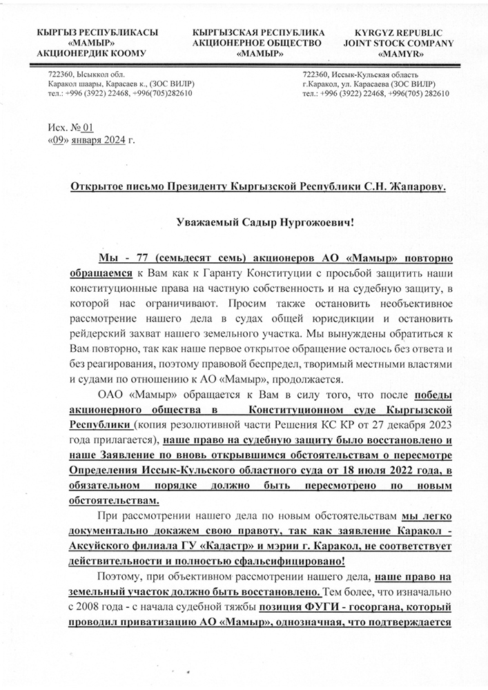 ОАО «Мамыр» обращается к вам в силу того, что после победы акционерного общества в Конституционном суде Кыргызской Республики (копия резолютивной части решения КС КР от 27 декабря 2023 года прилагается) наше право на судебную защиту было восстановлено. Наше заявление по вновь открывшимся обстоятельствам о пересмотре определения Иссык-Кульского областного суда от 18 июля 2022-го, которое ранее было отклонено, в обязательном порядке должно быть пересмотрено по новым обстоятельствам.