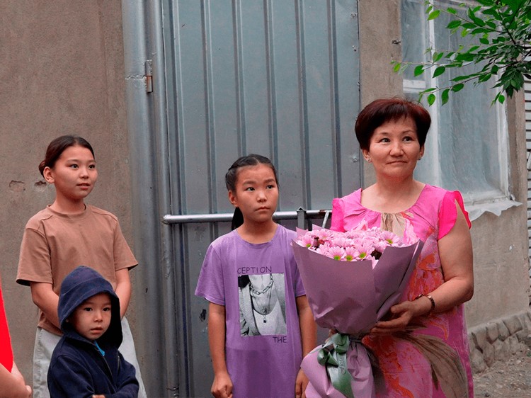 Далее сотрудники компании навестили мать девятерых детей — Астру Дуйшонбиеву и Гульнару Фаткулину, у которой 6 детей, 18 внуков и 3 правнука. Всю свою трудовую жизнь она проработала оператором-связистом.
