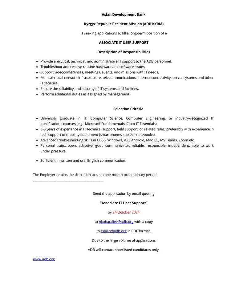 Постоянному представительству Азиатского банка развития (АБР) в Кыргызской Республике требуется