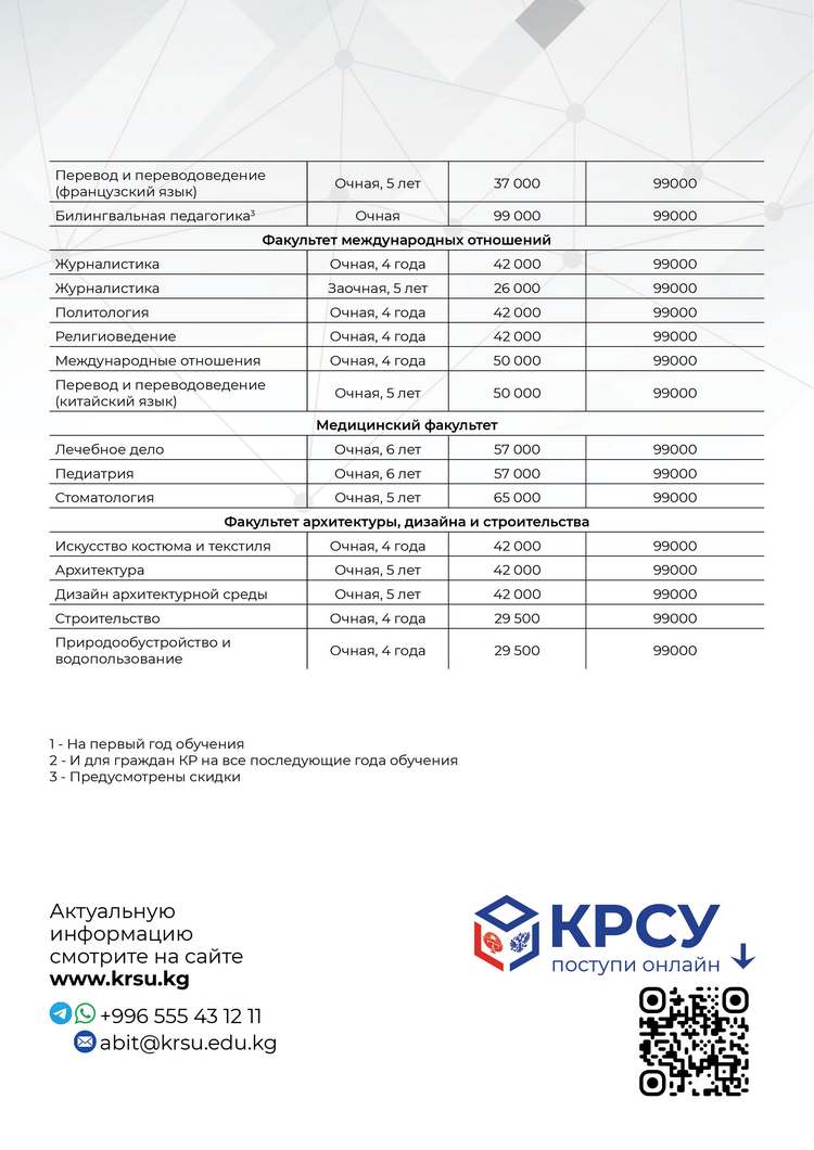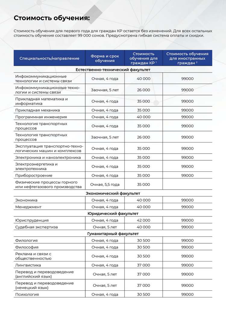 Стоимость обучения для первого года для граждан КР остается без изменений. Для всех остальных стоимость обучения составляет 99 тысяч сомов. Предусмотрена гибкая система оплаты и скидки.