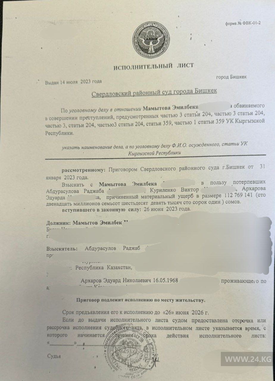 Приговором Свердловского районного суда столицы от 31 января 2023-го и судебной коллегией по уголовным делам Бишкекского городского суда от 26 июня прошлого года Эмилбек Мамытов признан виновным в мошенничестве в размере 112 миллионов 769 тысяч 141 сом. Однако суд не назначил наказание в виде лишения свободы в связи с истечением срока давности уголовного преследования.