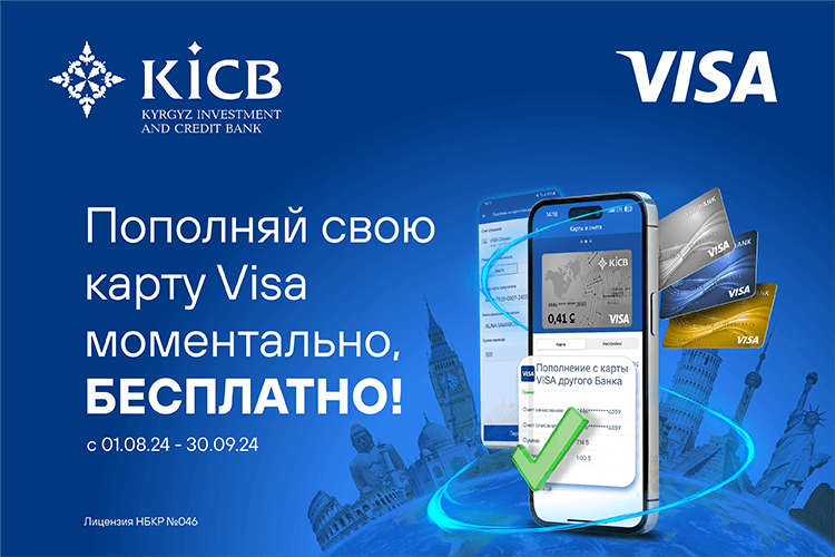 Успейте воспользоваться новой услугой для держателей платежных карт VISA KICB по переводу денежных средств по номеру карты, номеру телефона, а также по пополнению своей карты Visa cо своих карт Visa, выпущенных в любых других банках.
