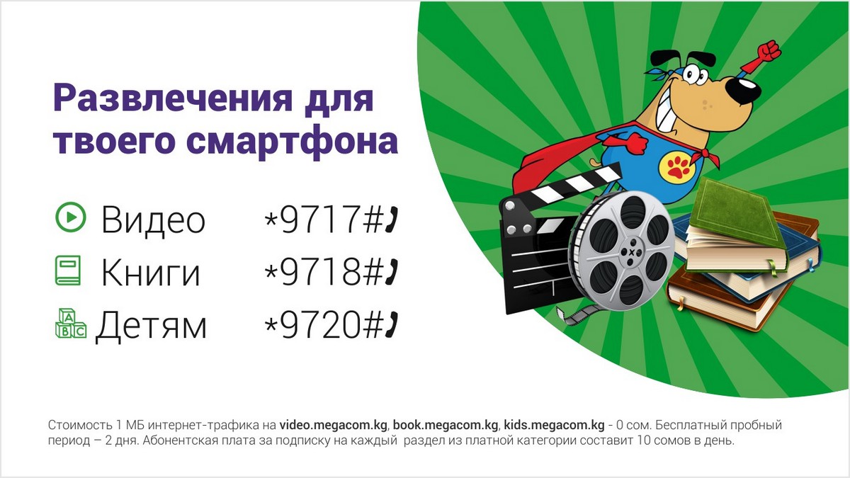 С MegaCom никогда не соскучишься, ведь компания заботится о досуге и приятном времяпровождении каждого абонента. Музыка, видео, книги, а также огромный выбор детских, развлекательных, познавательных, образовательных программ и видеороликов ждет вас на развлекательных порталах video.megacom.kg, kids.megacom.kg и book.megacom.kg без оплаты трафика!