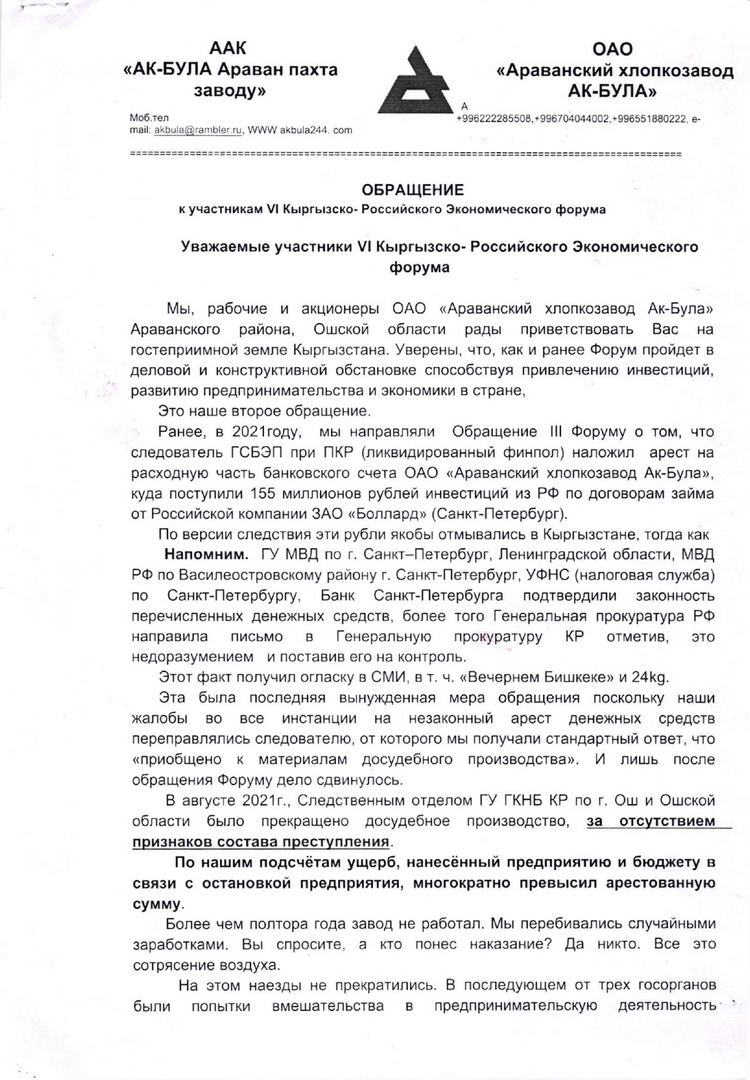 Ранее, в 2021 году, мы направляли обращение участникам III форума. Мы говорили о том, что следователь ГСБЭП (ныне ликвидированный Финпол) наложил арест на расходную часть банковского счета ОАО «Араванский хлопкозавод Ак-Була», куда поступили 155 миллионов рублей инвестиций из России по договорам займа от российской компании ЗАО «Боллард» (Санкт-Петербург).
