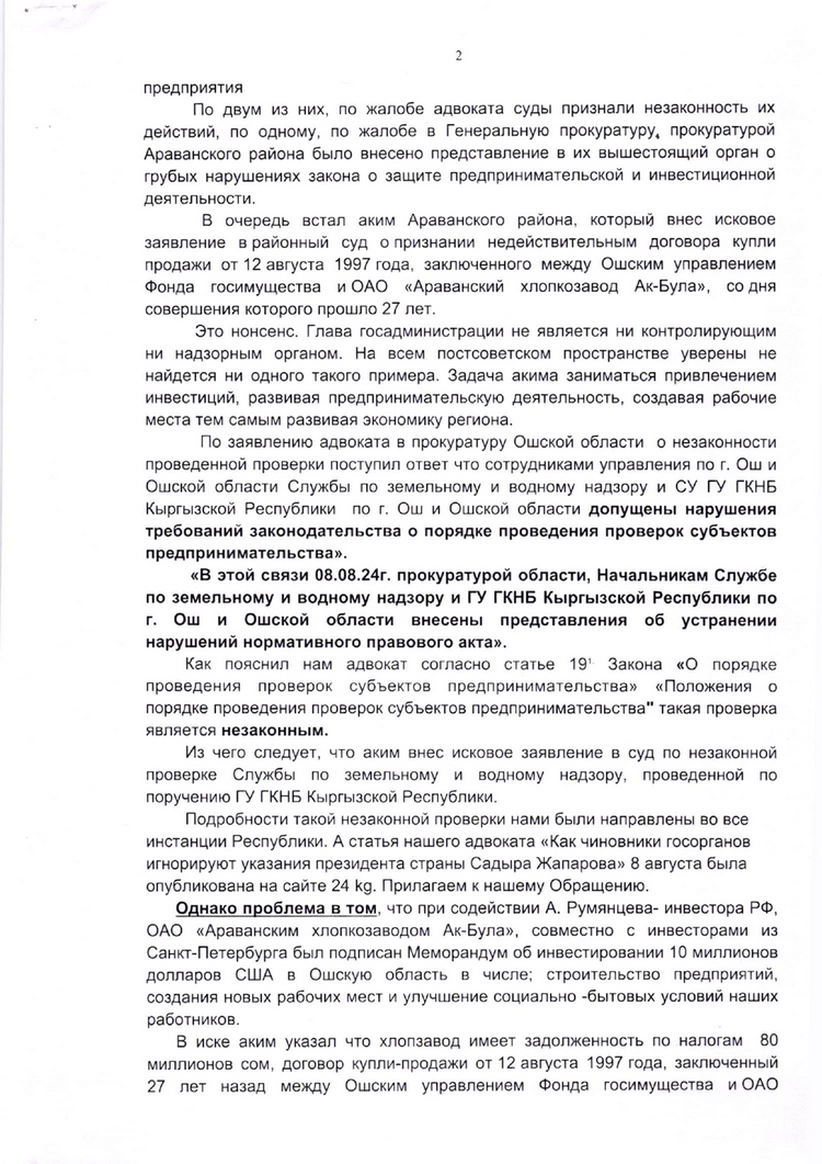 Коллектив и юристы ОАО «Араванский хлопкозавод «Ак-Була», где акционерами являются 112 человек, в том числе граждане Кыргызстана и Российской Федерации, продолжают борьбу за свое право просто работать и приносить пользу стране. Они направили открытое обращение участникам VI Кыргызско- Российского экономического форума, который сегодня, 11 сентября, открывается на Иссык-Куле: