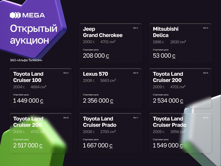 ЗАО «Альфа Телеком» (MEGA) объявляет о проведении торгов (открытого аукциона) на реализацию автотранспорта компании: