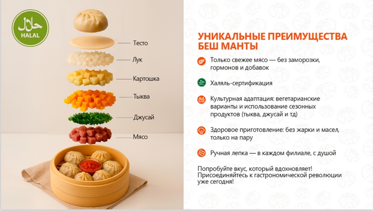 «Мы не просто показали продукт. Мы показали Кыргызстан, Центральную Азию, нашу кухню, наше гостеприимство, нашу философию еды», — говорят основатели. Манты как узнаваемое и любимое блюдо на постсоветском пространстве были переосмыслены как современный бизнес-продукт, понятный и привлекательный для международной аудитории.