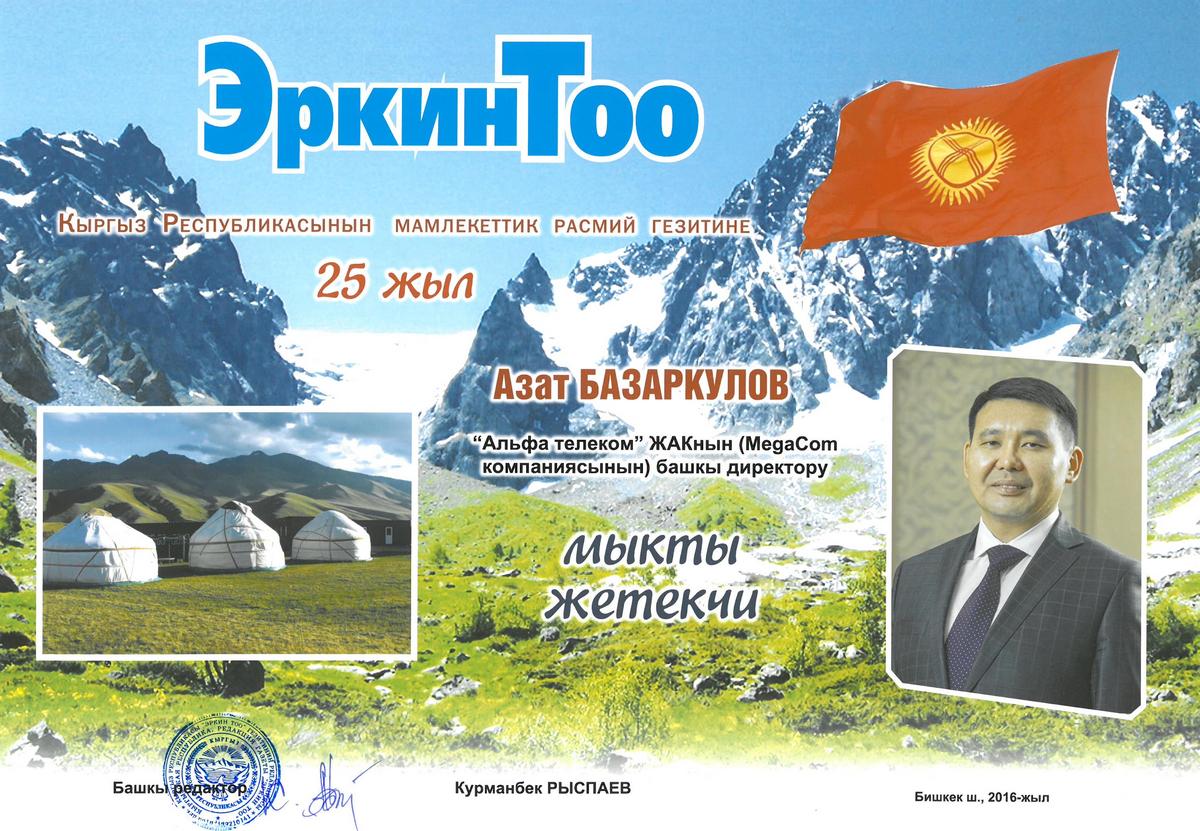 В честь своего 25-летия республиканская газета «Эркин Тоо» выбрала лучших из лучших в своих сферах деятельности. В особом выпуске газеты были отмечены видные политики, деятели культуры и искусства, меценаты и управленцы - все те, кто своей деятельностью и активной гражданской позицией вносят неоценимый вклад в развитие жизни общества Кыргызстана. Генеральный директор компании MegaCom Азат Базаркулов был признан лучшим руководителем.
