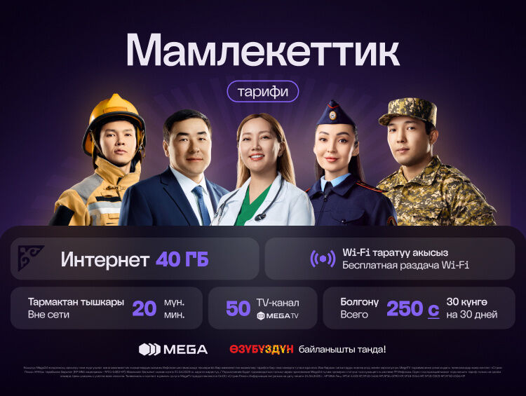 Государственный оператор сотовой связи MEGA с особой гордостью и уважением напоминает: для учителей, врачей, сотрудников МВД, МЧС, военнослужащих и всех работников государственных учреждений действует уникальный тариф «Мамлекеттик».