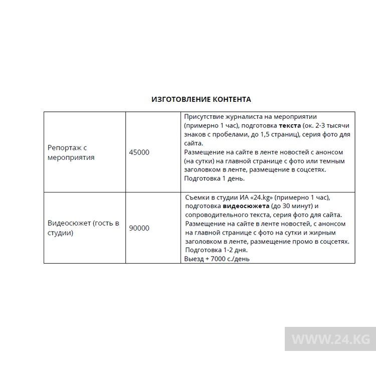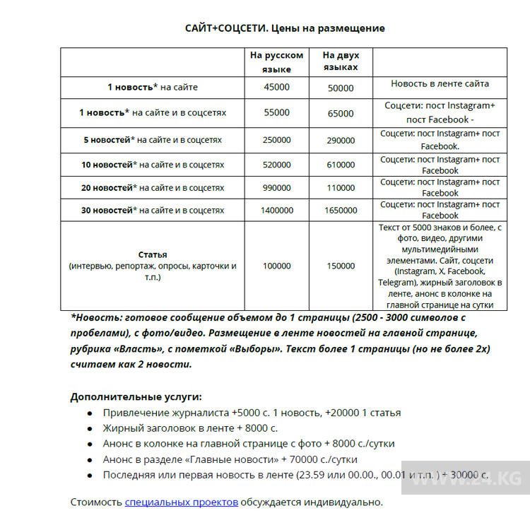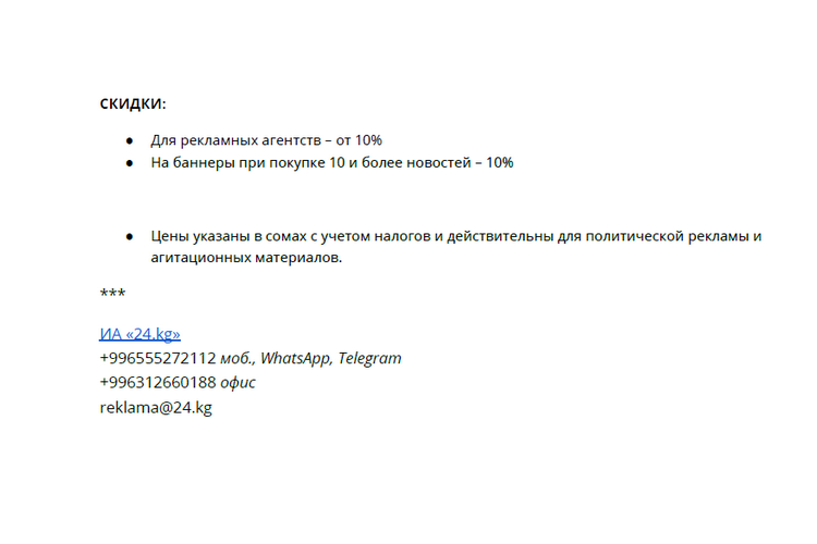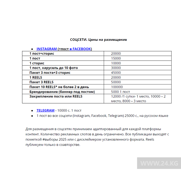 Стоимость размещения политической рекламы и агитационных материалов на сайте https://24-kg.com/ и в соцсетях на страницах ИА «24-kg.com».