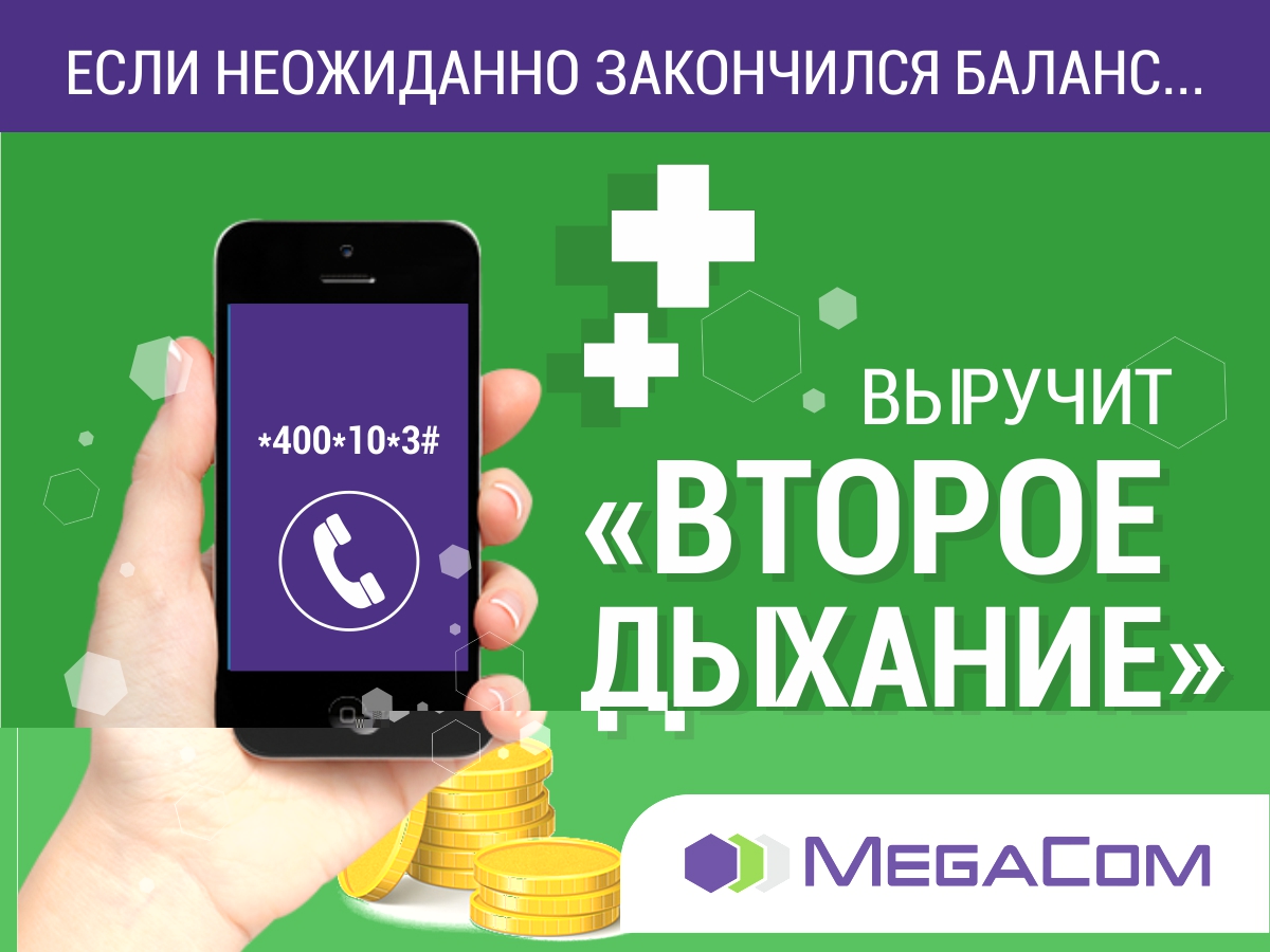 Благодаря услуге «Второе дыхание» абсолютно все абоненты MegaCom могут быть на связи даже при нулевом балансе. Услуга предоставляет беспроцентный кредит на сотовую связь.