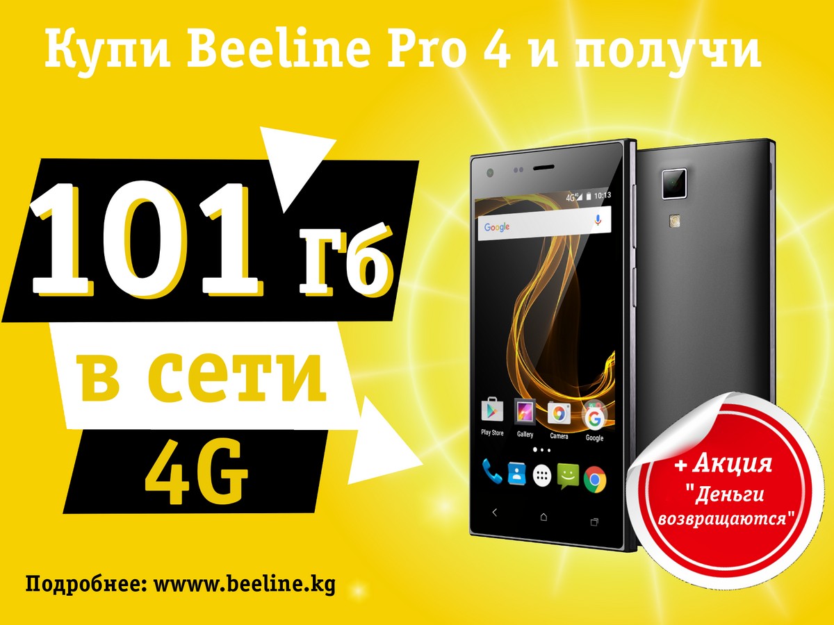 Beeline продолжает радовать клиентов доступными качественными цифровыми девайсами и щедрыми акциями. Так, при покупке современного смартфона BeelinePro 4 с поддержкой 4G клиенты Beeline получат 101 Гб высокоскоростного 4G Интернета и возможность вернуть деньги с акцией «Деньги возвращаются».