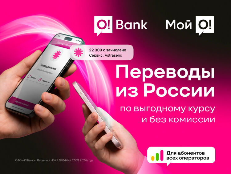 Перевод доступен онлайн в приложении «Мой О!», а также в любом офисе O!Bank и O!Store — быстро, без комиссии и с зачислением по выгодному курсу сразу на счет в сомах.