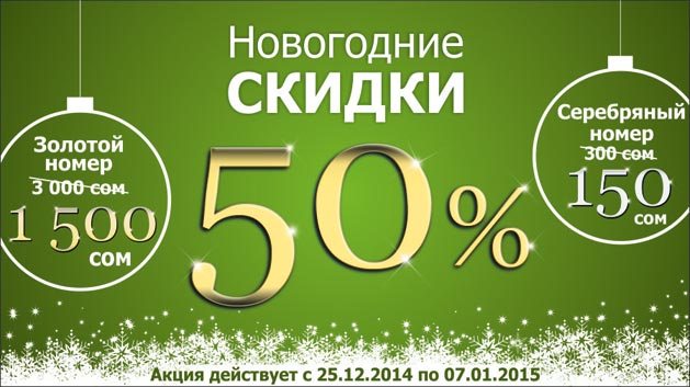 С 25 декабря 2014 года по 7 января 2015-го во всех центрах продаж и обслуживания, а также в фирменных салонах компании каждый абонент сможет принять участие в новогодней акции; получить бесплатные SMS-сообщения, а также воспользоваться грандиозными скидками в 50 процентов на приобретение номеров категории «золото» и «серебро».
