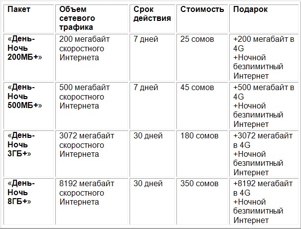 1. Интернета стало больше, а цена во много раз ниже! Судите сами: если раньше пакеты «День-Ночь 500+» включали в себя 500 МБ днем и 500 МБ ночью за 100 сомов в неделю, то теперь они включают 500 МБ днем и неограниченное количество МБ ночью всего за 45 сомов плюс 4G бонус.