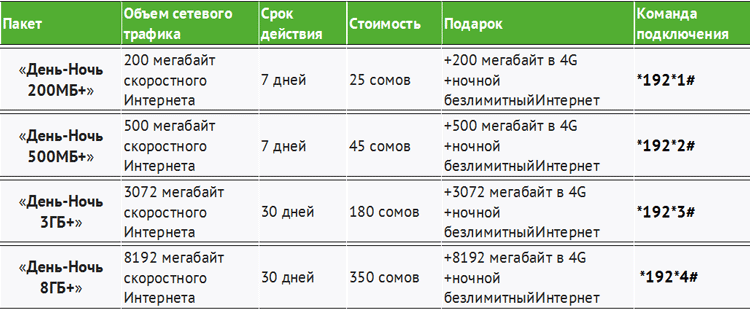 1. Интернета стало больше, а цена во много раз ниже! Судите сами: если раньше за 350 сомов можно было подключить пакет «День-ночь 2000+», включающий в себя 2000 мегабайт днем и 2000 мегабайт ночью, то теперь за эту же сумму вы можете подключить пакет объемом 8 ГИГАБАЙТ днем и неограниченное количество ГИГАБАЙТОВ ночью плюс 4G бонус — еще 8 ГИГАБАЙТ.