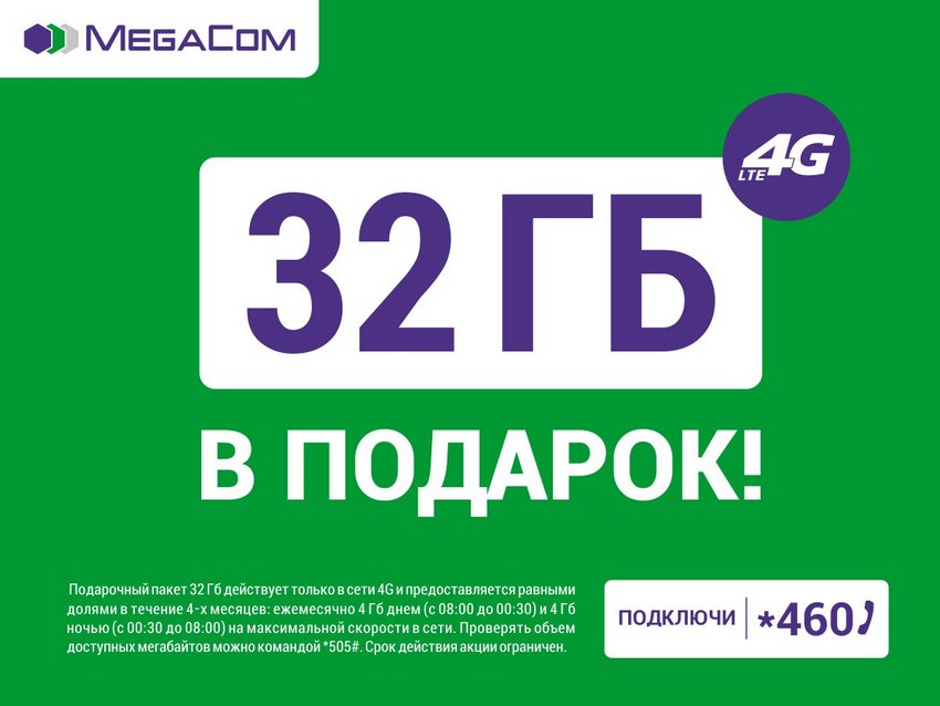 Теперь до 30 июня 2017 года вы можете получить 32 ГБ высокоскоростного интернета абсолютно бесплатно, просто подключив сеть четвертого поколения 4G LTE от MegaCom по команде *460 (вызов).