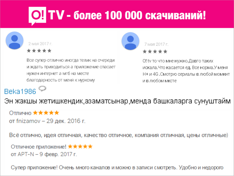 Команда мобильного оператора О! с радостью сообщает, что несколько дней назад приложением O!TV был преодолен порог в 100 тысяч пользователей!