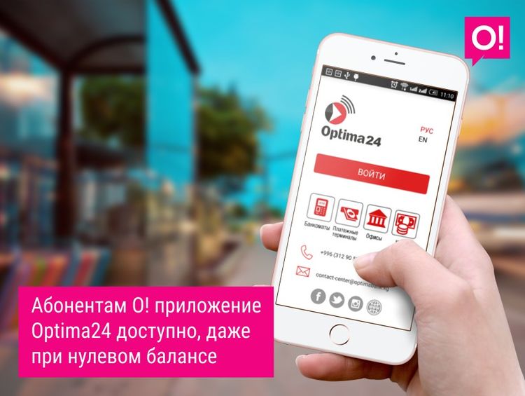 Благодаря тесному сотрудничеству мобильного оператора О! и одного из ведущих банков Кыргызстана «Оптима Банк» теперь все абоненты сети О! могут пользоваться мобильным приложением бесплатно даже при нулевом балансе. Интернет-трафик при использовании приложения Optima24 в сети О! не тарифицируется и не учитывается.