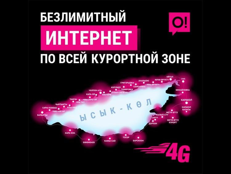 4G-сигналом сети О! на высоких скоростях охвачены основные зоны гостеприимства лазурного берега: Каракол, Чолпон-Ата, Балыкчи. Кроме крупных населенных пунктов, 4G-сеть О! работает в селах, Чон-Cары-Ой, Сары-Ой, Кара-Ой, Бостери, Бактуу-Долоноту, Григорьевка, Ананьево, Тюп, Жол-Колот, Ак-Суу, Кызыл-Суу.